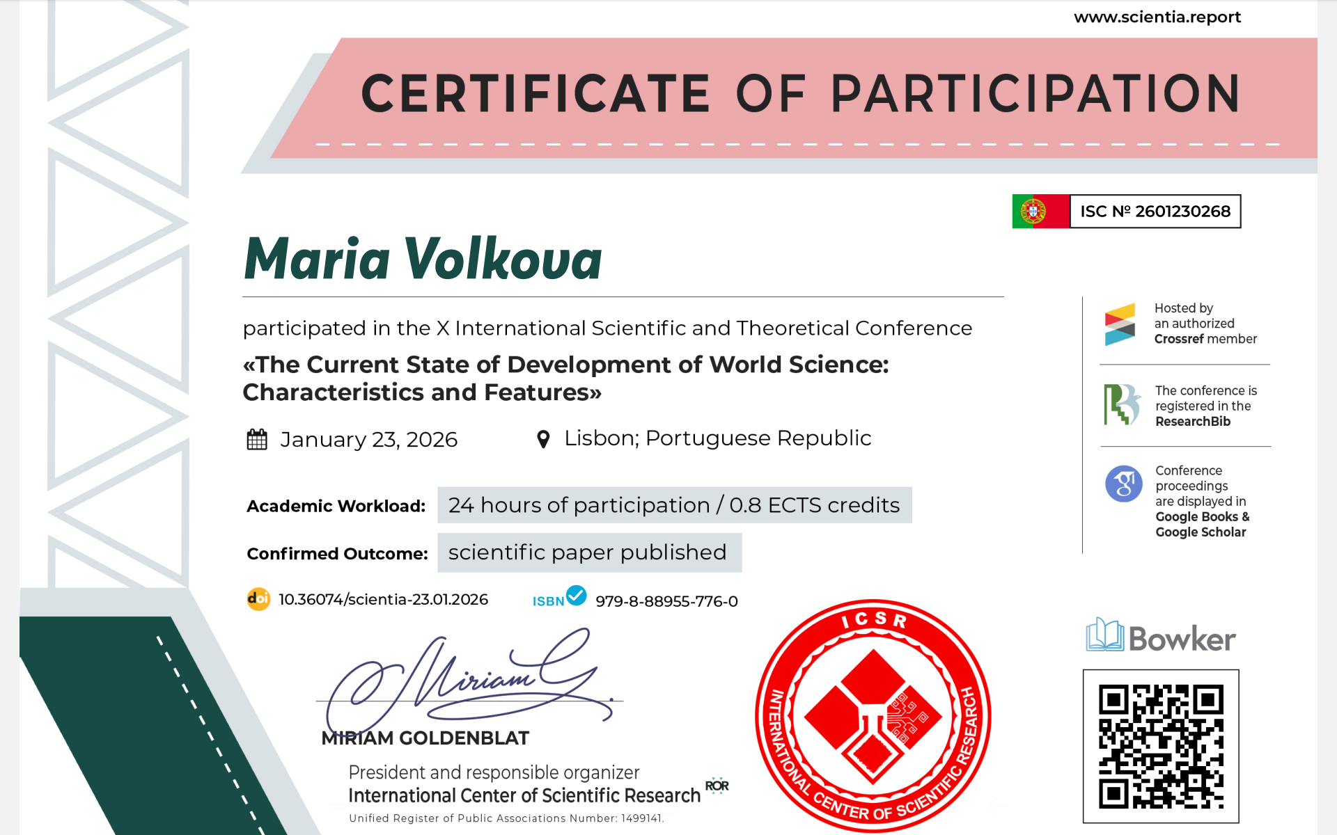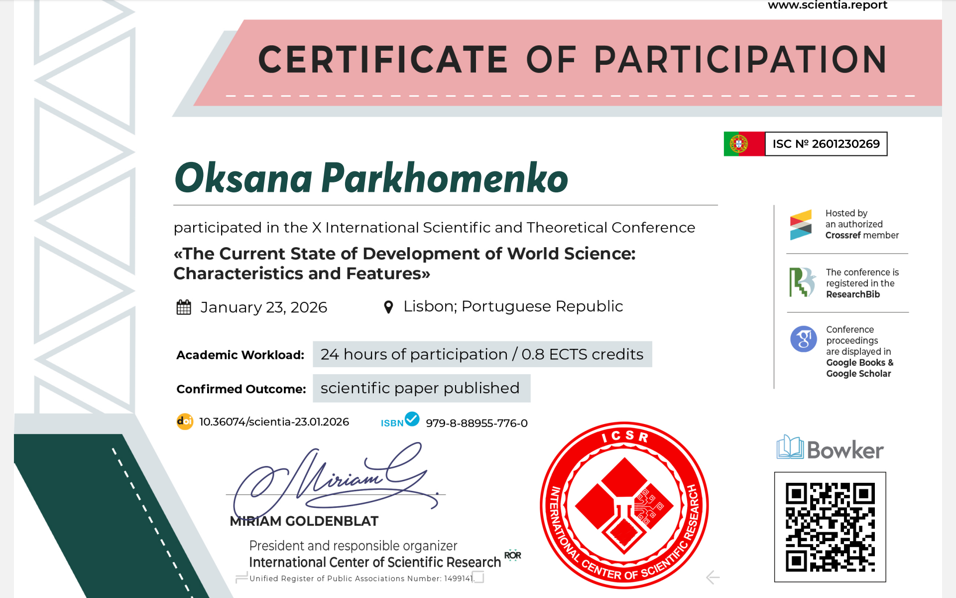 The scientific life of our institute continues to actively develop beyond the country's borders, strengthening international ties and opening new horizons for young researchers. Recently, representatives of our academic family — lecturer Oksana Parkhomenko and student Mariia Volkova — became active participants in the X International Scientific and Theoretical Conference "The Current State of Development of World Science: Characteristics and Features," held in the picturesque capital of Portugal, Lisbon.